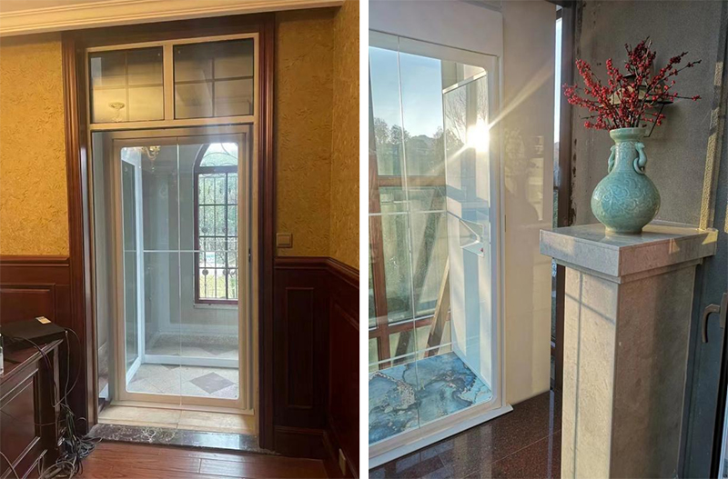 在工程师上门勘测时发现,除了考虑配合别墅整体新中式风格,还有一大难点是屋内井道旁就连着锅炉房,常规电梯安装势必会影响旁边锅炉房的正常通行,必须采用定制方案。因此,HOUSTY电梯轿厢主体以现代的白色和原木色为主色调,采用三面玻璃井道设计,安装在楼梯中间,不仅有效利用空间,而且通透明亮,并通过两侧开门的形式,在不影响楼梯上下光线的同时,恰到好处地延用锅炉房通道空间,不浪费一丝空间,为整体家居的空间塑造添力。